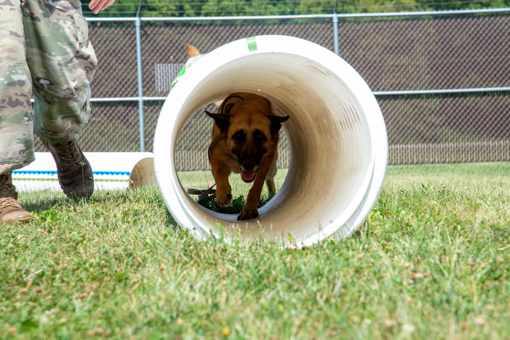 Base kennel gets new obstacle course Published Sept. 10, 2021 By Airman 1st Class Jack Gardner 88th Air Base Wing Public Affairs WRIGHT-PATTERSON AIR FORCE BASE, Ohio -- Keeping up with training for military working dogs can be significant work and requires attention to detail. For the 88th Security Forces Squadron, keeping the K-9s sharp and properly trained presents a next-level challenge. That challenge finally became easier this summer with a brand-new obstacle course for the kennel on Area A of Wright-Patterson Air Force Base. The course was first requested over two years ago when the old one fell into disrepair and could no longer be used, 88 SFS officials said. The project took $25,000 to complete. Getting the new obstacle course allows the dogs and their handlers to get back to the form of training they are used to. “We needed this,” said Staff Sgt. Matthew Watkins, 88 SFS military working dog handler. “The last course had taken a beating from winds, storms and snow. Having this new course allows us to train the dogs the way we need to train them, in an environment that we have full control over.” Before the course opened July 14, handlers were taking the dogs to different locations on base to try and simulate movements the K-9s might need to make in a real-world situation. That method wasn’t always a success, however. “We love having the course because it allows us to train the dogs to do the movements they might need to do, all while staying close to them and making sure they understand that the handler is in charge,” Watkins said. “Going other places might not allow us that ability.” The military working dogs spend most of their time getting the training they need to be at the top of their games. In order to do that, trainers must be able to teach them how to follow a command. “A major part of having the control is being able to get the dog to understand that when an input is given by the handler, they need to obey it,” said Staff Sgt. Tyler Adams, 88 SFS military working dog handler and trainer. “A handler who lets their dog go through the course alone isn’t a good handler; completing the course while being side by side with your dog lets them know you are in command.” When the dogs have to go to other environments, they can become distracted and may not learn to obey orders the same way, Adams says. The new obstacle course allows them to get back to training in a controlled, quiet environment.