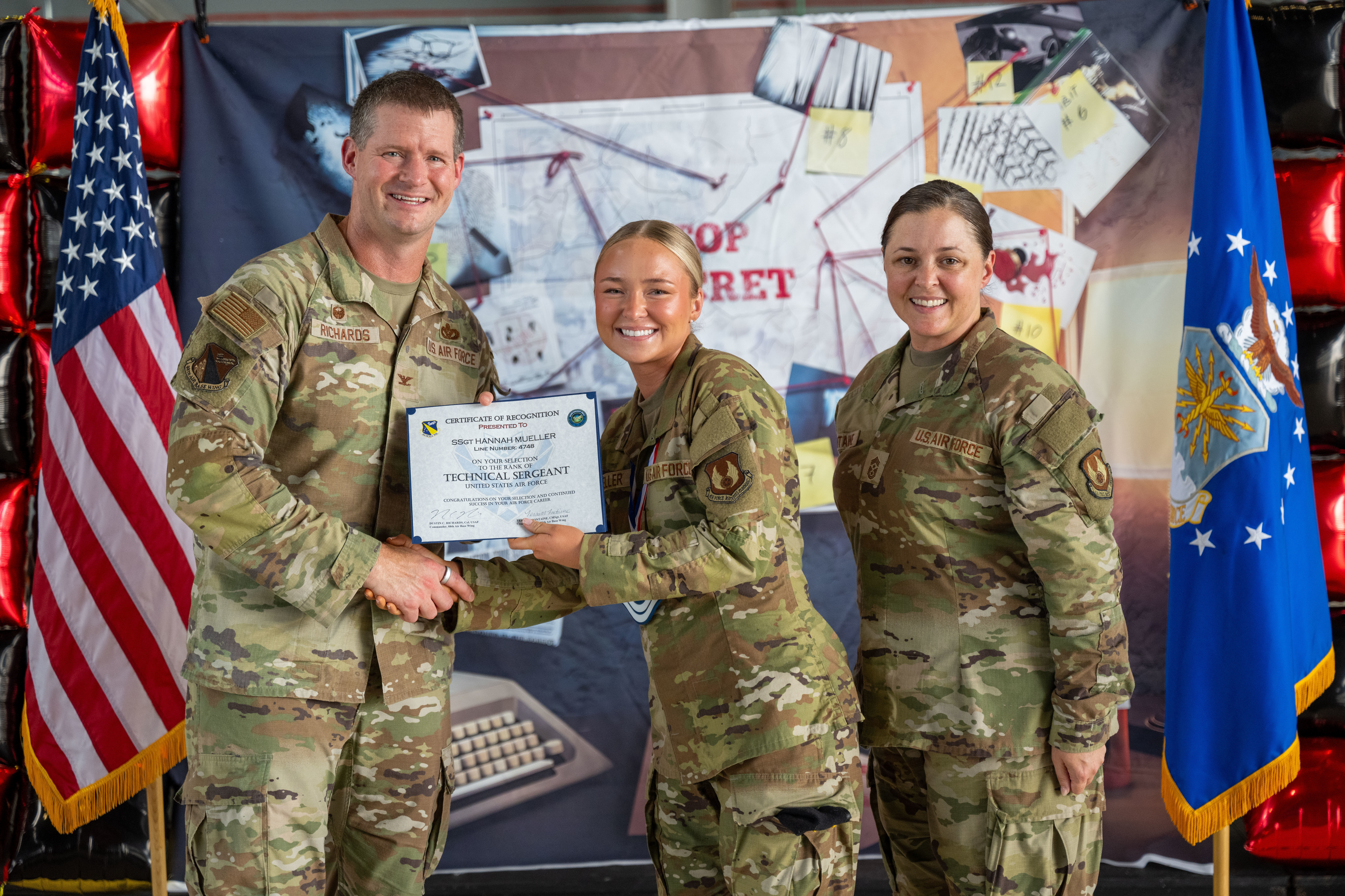 U.S. Air Force Col. Dustin Richards (left), 88th Air Base Wing and installation commander, and Chief Master Sgt. Tessa Fontaine (right), 88 ABW command chief, congratulate award recipients at the Chief Master Sgt. Grace A. Peterson Airman Leadership School graduation ceremony at Wright-Patterson Air Force Base, Ohio, June 26, 2025. ALS is required for staff sergeant selects, and open to eligible civilians, as Airmen learn more about leadership and Air Force culture. (U.S. Air Force photo by Daniel